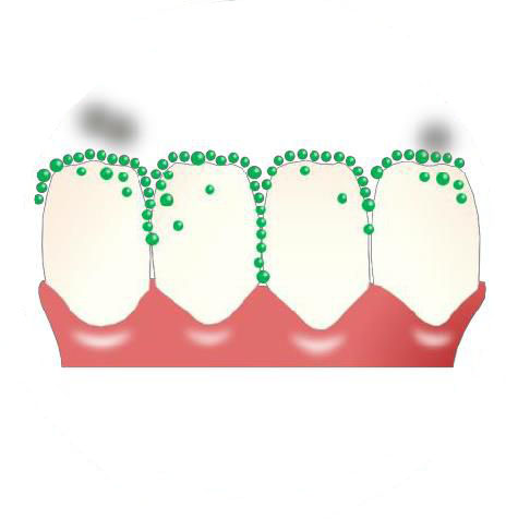 歯の表面に付着した汚れであるステインにホワイト溶液を塗布することで、ステインの周りに酸化チタンが吸着します。その状態で青色LEDを照射する事によって、歯の表面上で『光触媒』という化学反応を起こし無理なくステインを浮き上がらせます。